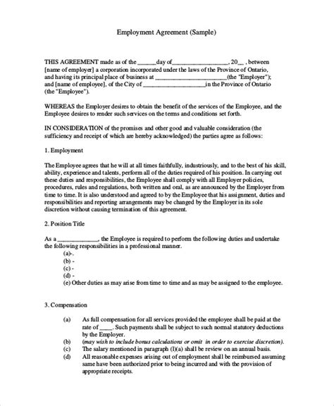 Employee Agreement Sample - Size 6 to 9 pages. Employee contracts contain details like hours of work, the. An employee contract template can be used to formalize your employment agreement with a new employee. Here are the most common types of employment agreements samples to consider:. An employment contract is a legally binding agreement between an employer and.